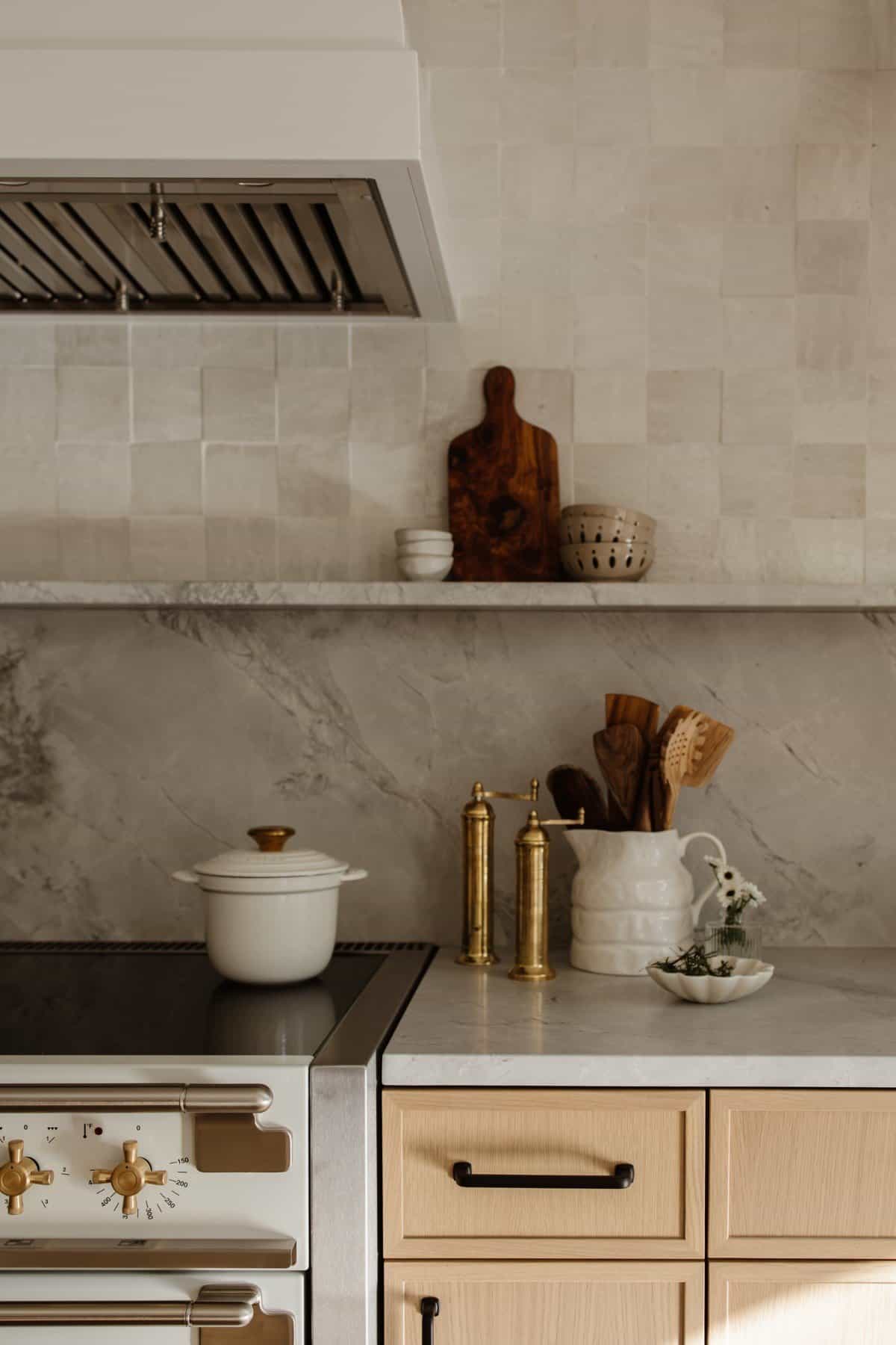 Bright, sleek bathroom shower with brass showerhead and controls for elegant appeal.